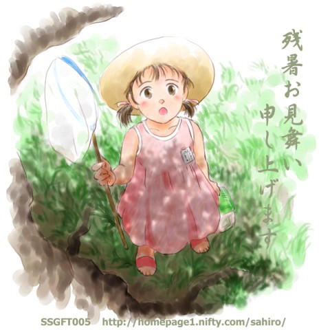 「………」 ――何を見つけたのかな? 夏休みに入ると巷でよく見られる、虫取り網を 手にした少年少女の姿。 日陰ではぁはぁしている大人の目から見ると、 強烈な日差しをものともせず、走り回っている 子供達は驚異です(^^; なんであんなに元気なんだろう? 体が小さいと、熱もたまりにくいのかな〜。 あ〜子供いいな〜〜夏休み〜〜