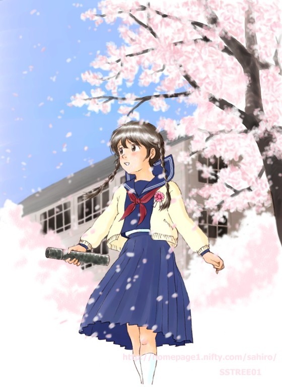 初めは雪が降っている情景を描こうと思った のですが、なぜか桜絵に(^^; ソメイヨシノの開花は大抵3月末以降なので、 卒業式に桜が咲いていることは殆どありません。 (心象風景だと思っていただければ ^^;) でも去年なんか3月末には既に散ってたりと、 近年は気象が不安定。今年の開花はいつかなあ。